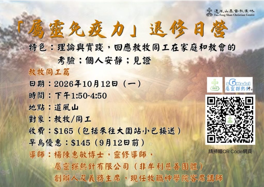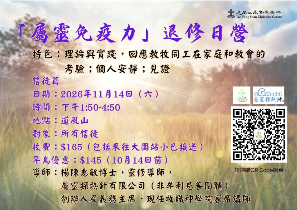 有興趣的朋友,請按以下連結,或掃海報的二維碼。https://www.tfscc.org/events/spiritual_immunity_retreat_day_pastoral_staff_session-believers_session/